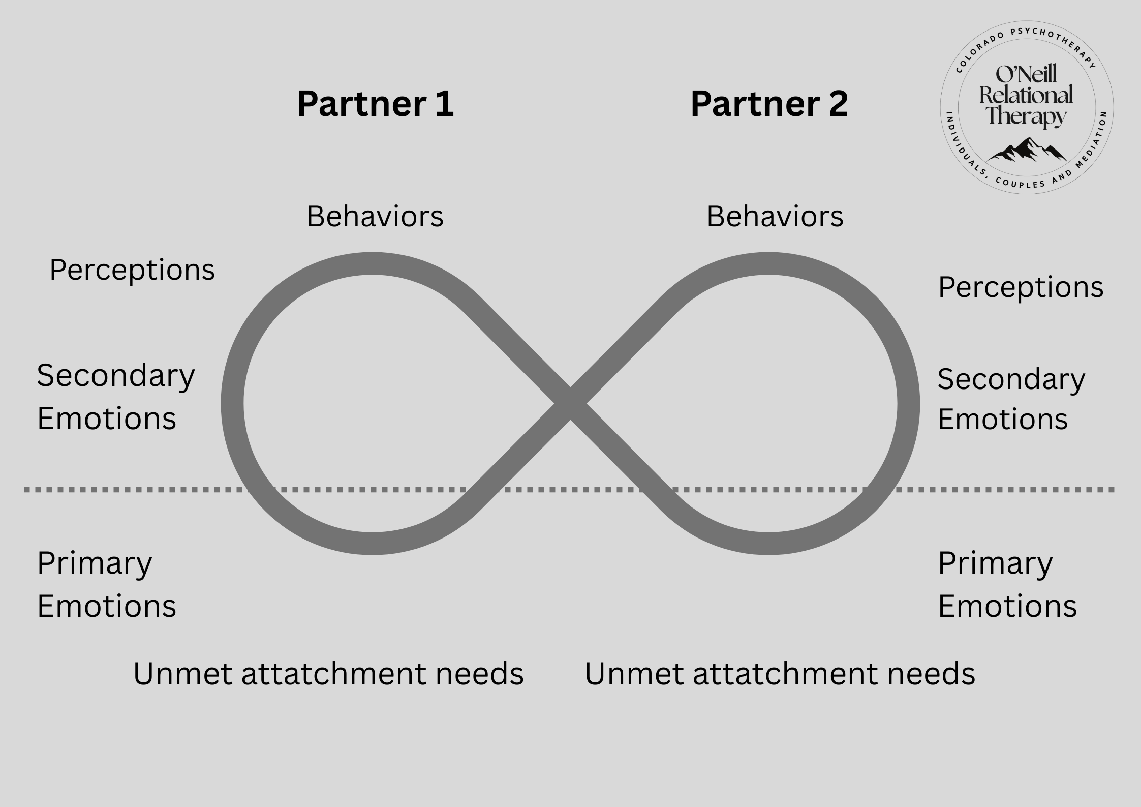 During tense interactions, it’s easy to focus on what’s happening above the dotted line: perceptions, secondary emotions, and behaviors. This is where relationship conflict and communication patterns tend to escalate; misunderstandings, frustration, reactivity, and the stories we tell ourselves about each other. In these moments, couples often get stuck in cycles of arguing, withdrawing, or trying to be understood, which can unintentionally keep the conflict going.