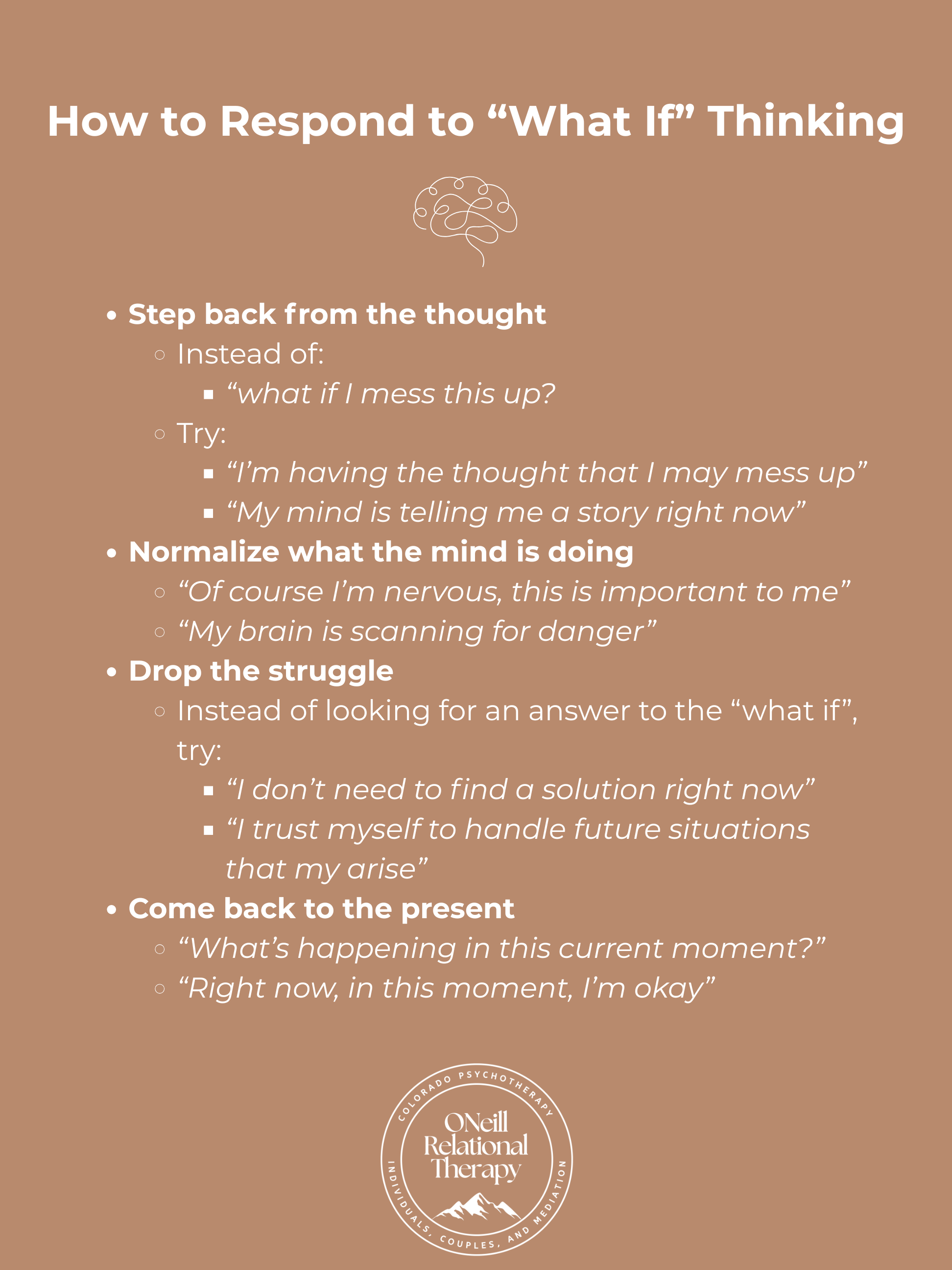 Instead of trying to stop the thoughts or get rid of the worry, it can be more helpful to change how you respond to anxiety and “what if” thinking.